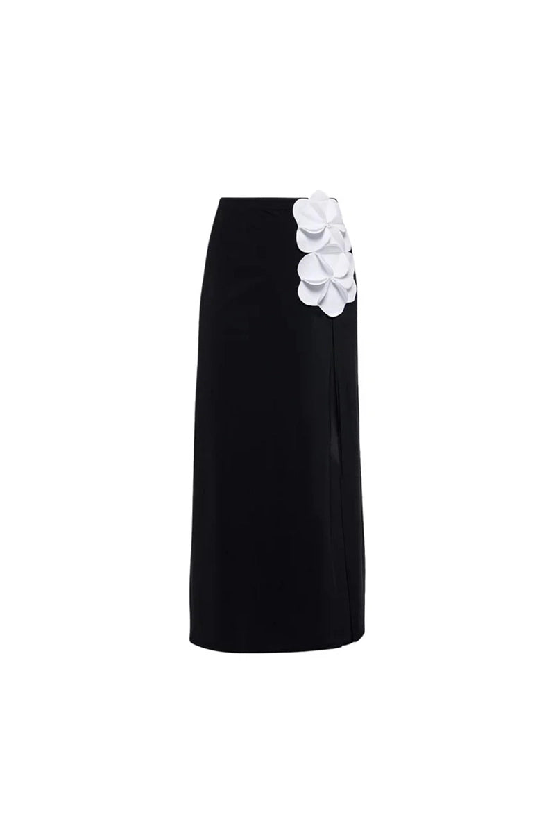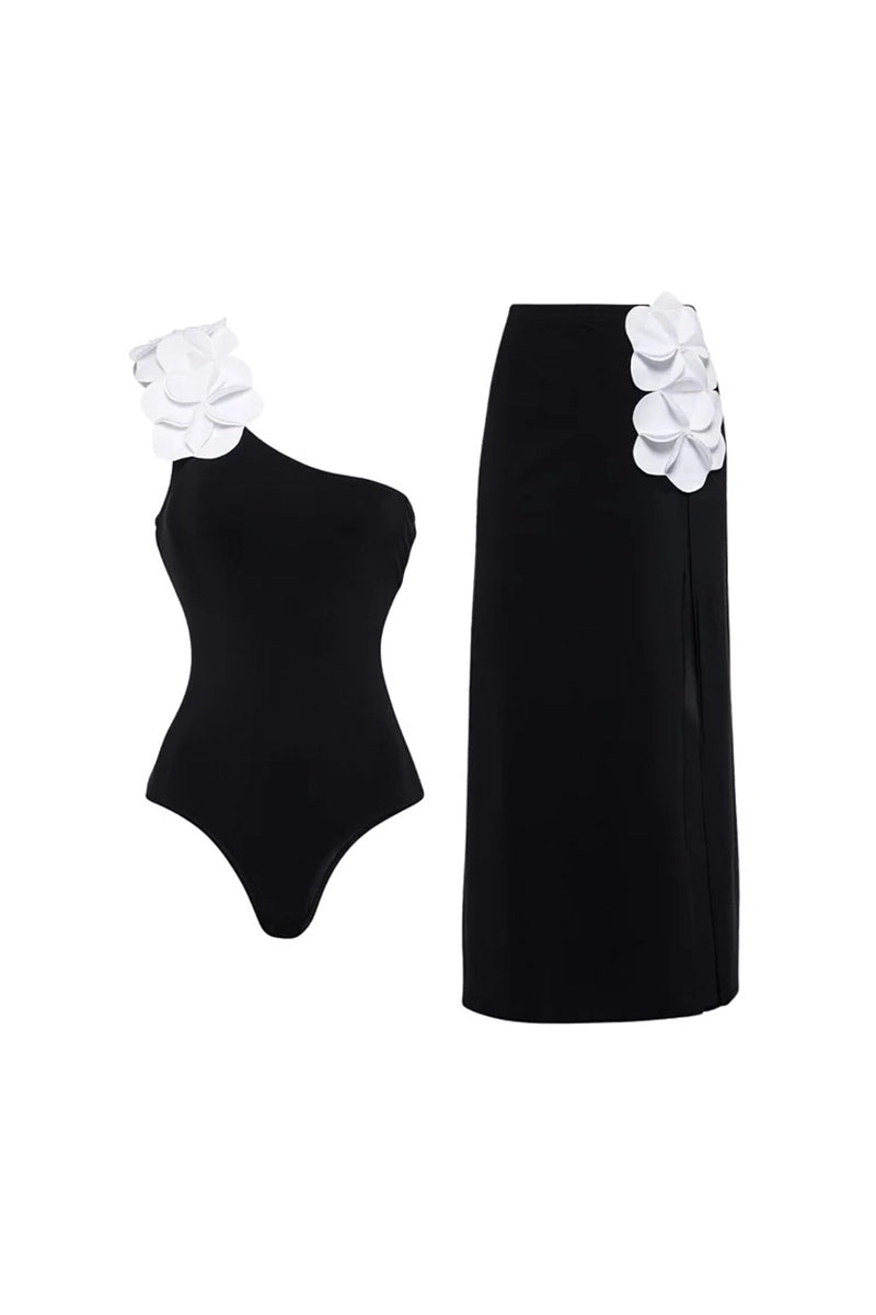 Sophisticated with a bold twist, this one-shoulder black swimsuit features an elegant bandeau design accented by a striking 3D floral embellishment. A perfect blend of minimalism and statement style for the modern beach muse.