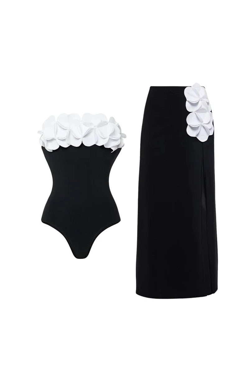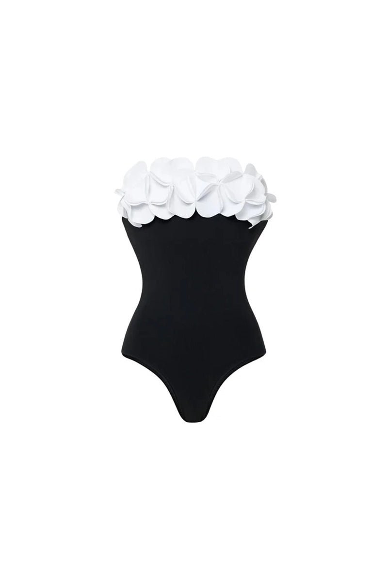 Elegantly bold, this strapless black swimsuit features stunning 3D floral appliqués that bring texture and romance to a classic silhouette. The perfect piece for women who love minimalist tones with standout details.
