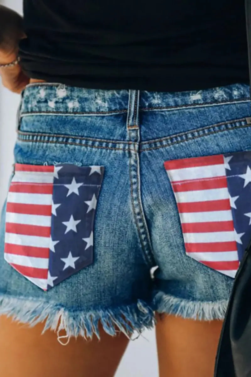 These stylish denim shorts feature a unique flag print design and a flattering slim fit. The distressed detailing and single-button closure add a trendy vibe, making them the perfect piece for a bold summer look. Designed to keep you comfortable while turning heads.