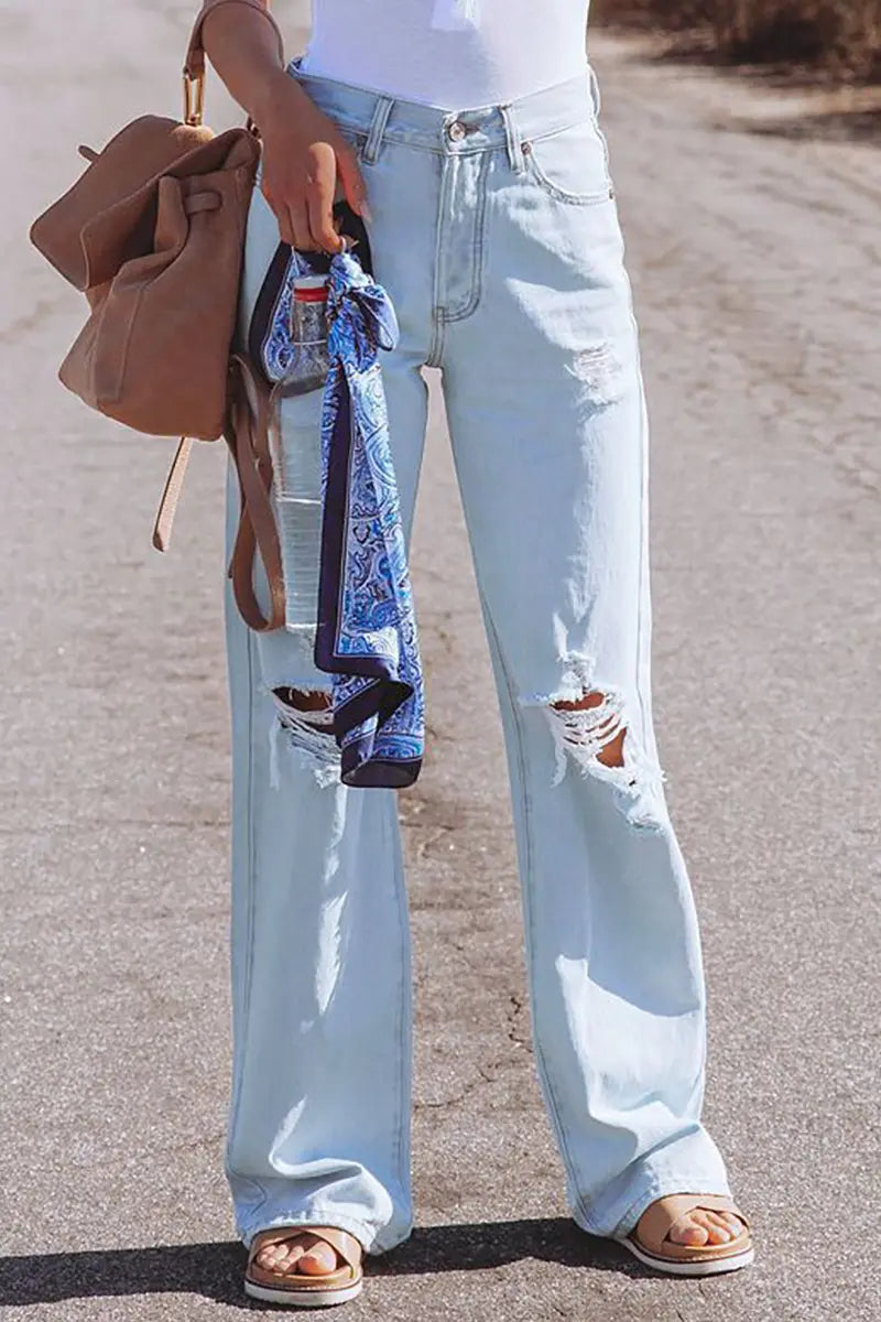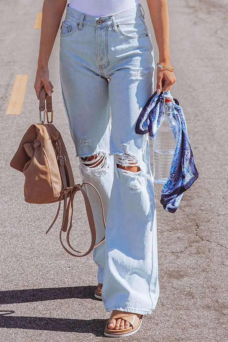 These high-waist distressed wide-leg jeans are the perfect combination of effortless style and comfort. The ripped detailing adds a trendy edge, while the wide-leg design flatters various body shapes, making them a must-have for casual yet chic outfits.