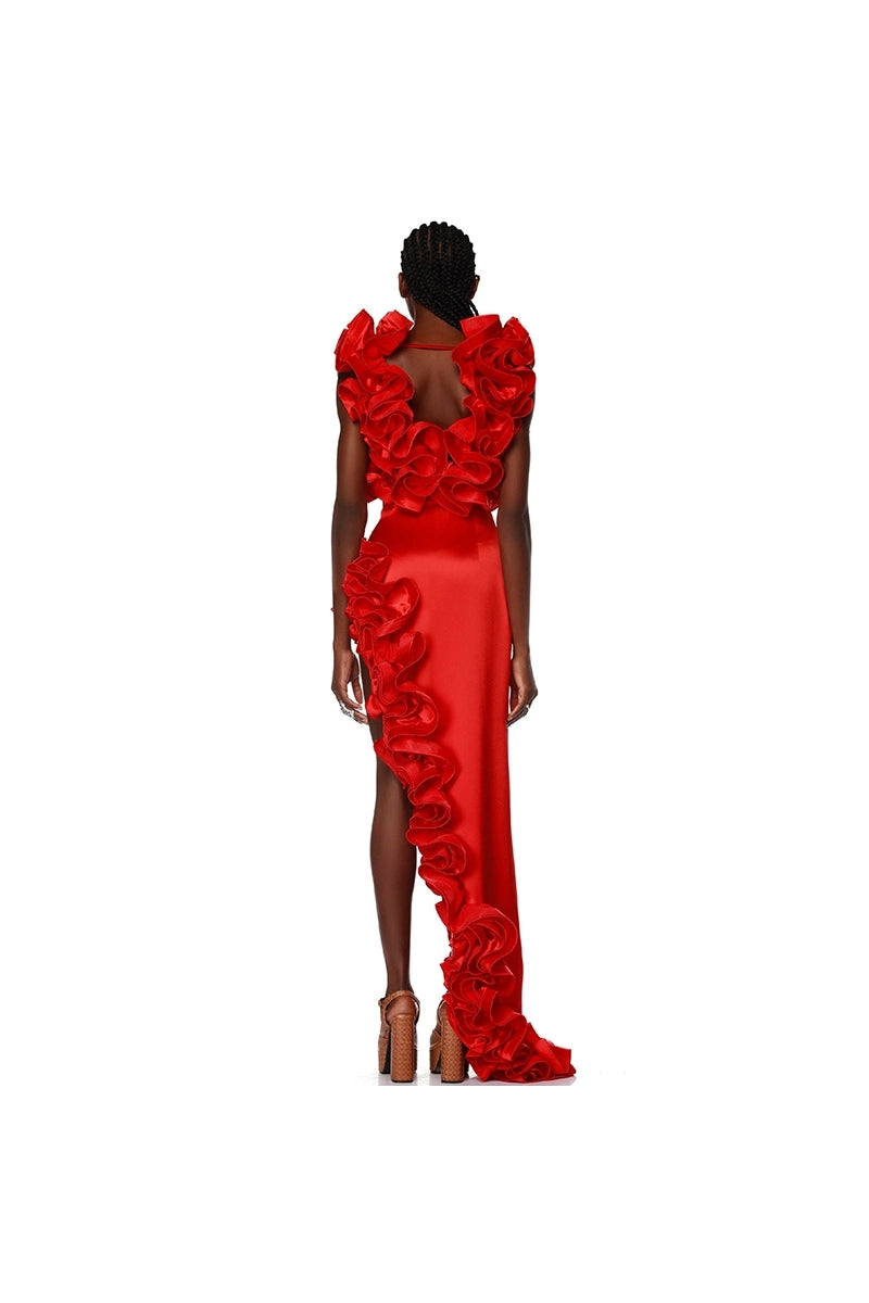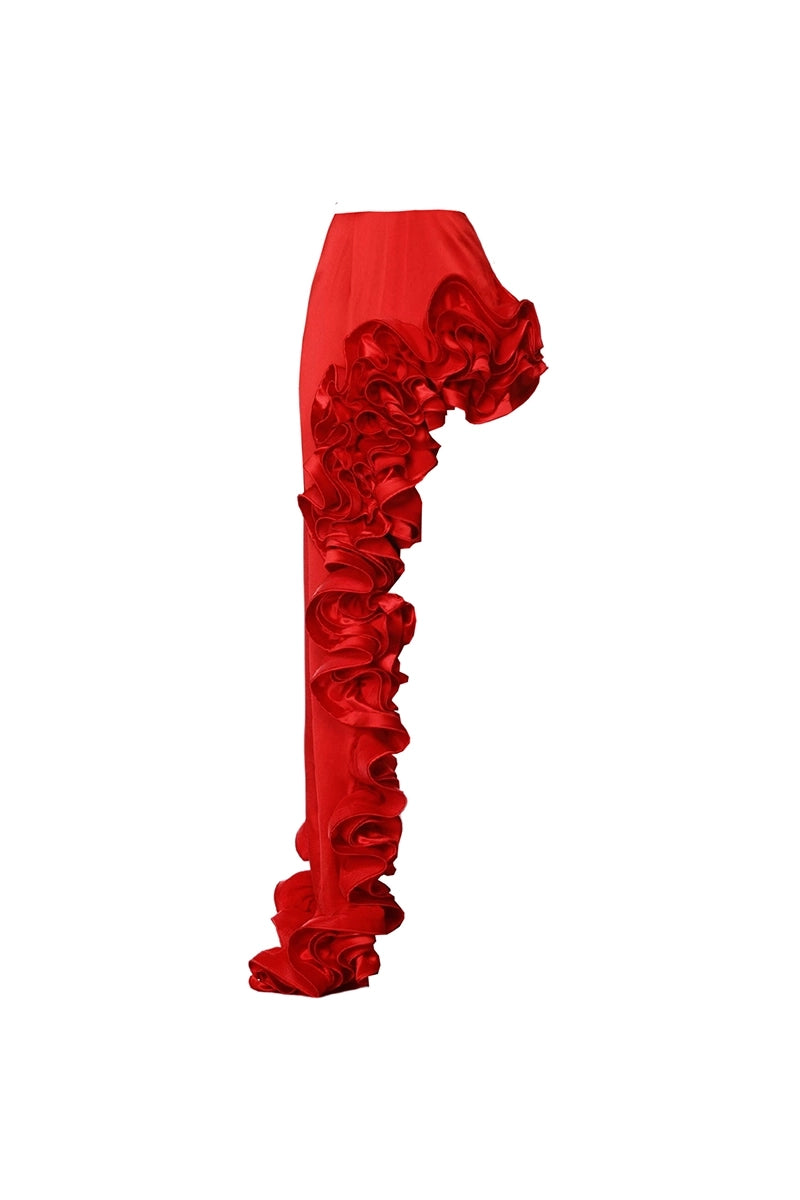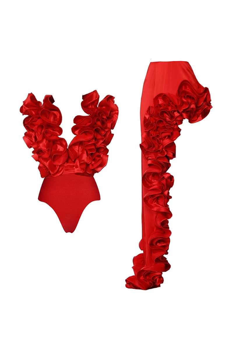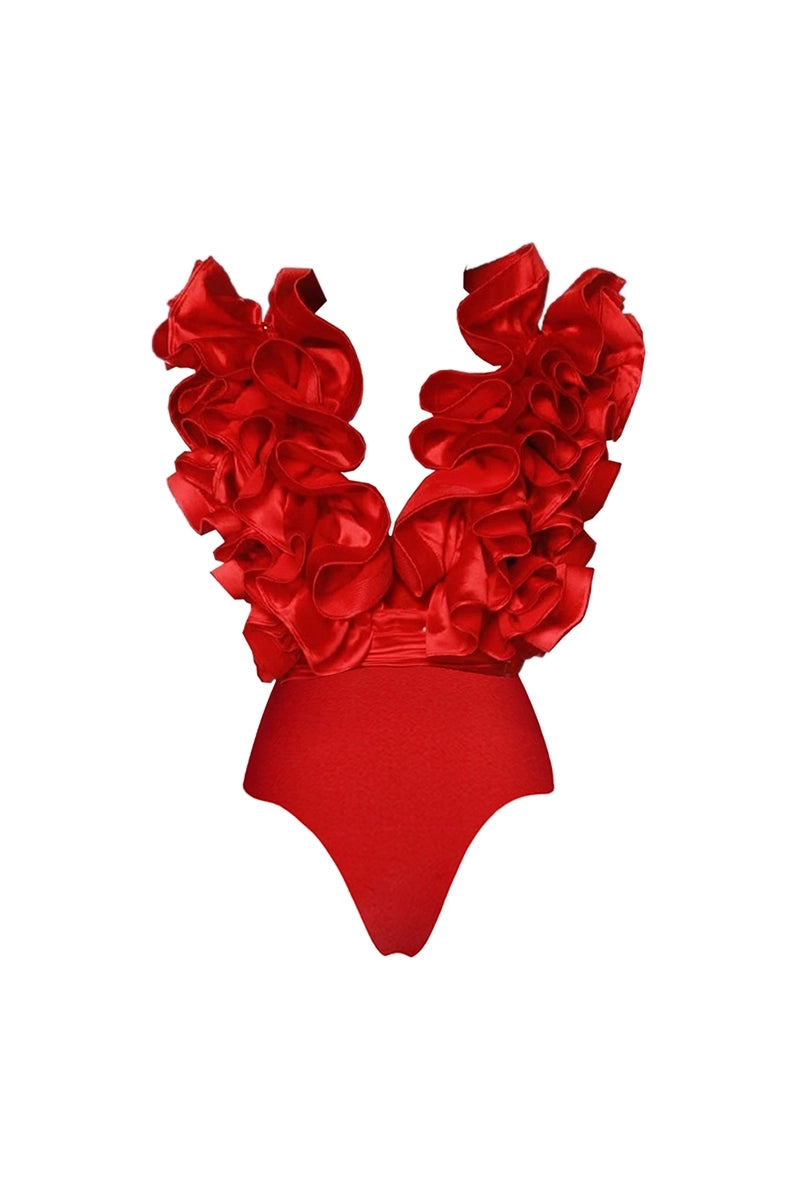 Val op in deze gedurfde rode badpakset met een flatterende V-hals, romantische gerimpelde rand en een asymmetrische zoomrok. Dit vurige, modieuze ontwerp combineert elegantie met speelse charme — gemaakt voor strandliefhebbers die graag opvallen.
