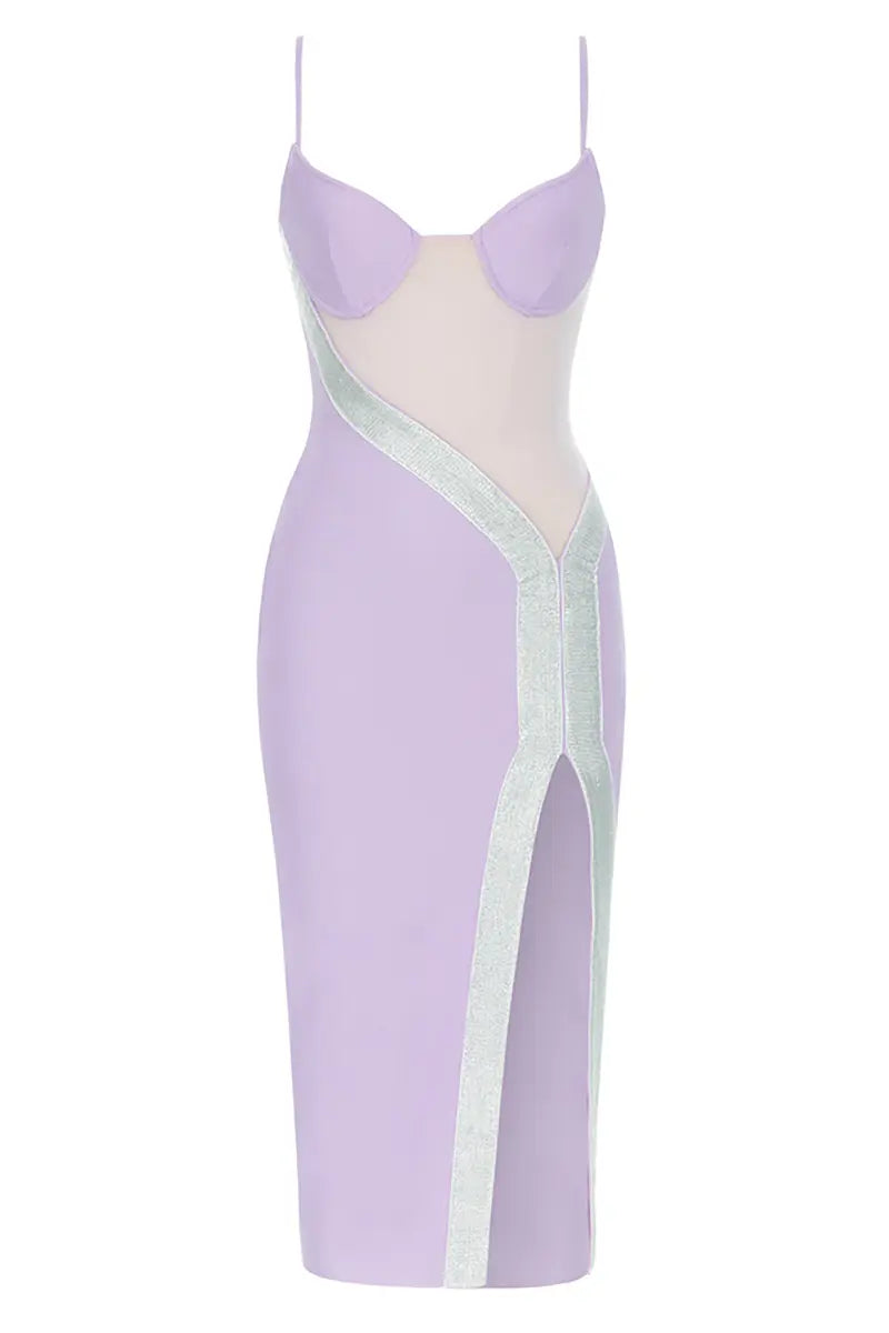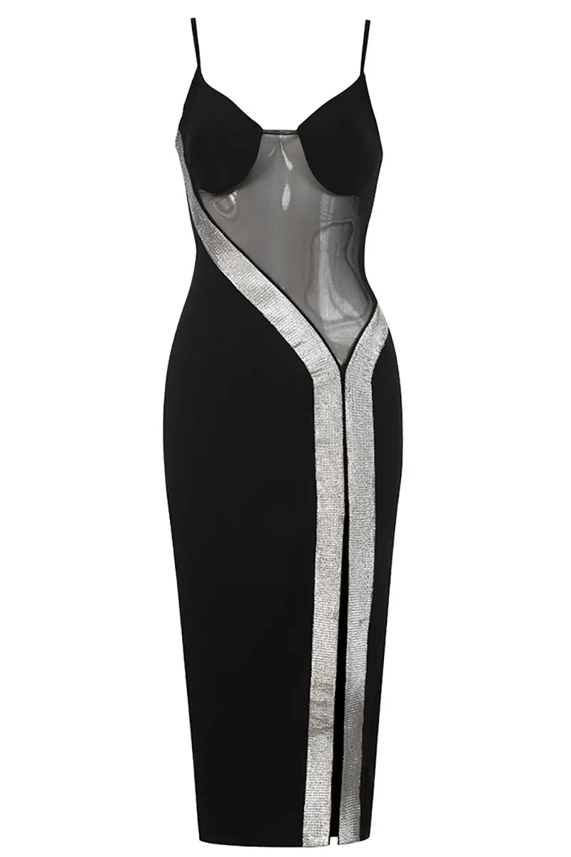 Deze sexy jurk met vintage-invloed heeft een verleidelijke rugloze ontwerp met delicate spaghetti bandjes en doorschijnende mesh inzetstukken. De figuuraccentuerende silhouet wordt benadrukt door een gedurfde zijsplit, wat een verleidelijke maar elegante uitstraling creëert. Perfecte combinatie van tijdloze charme en moderne verfijning, deze jurk is een must-have om onvergetelijke indrukken te maken.