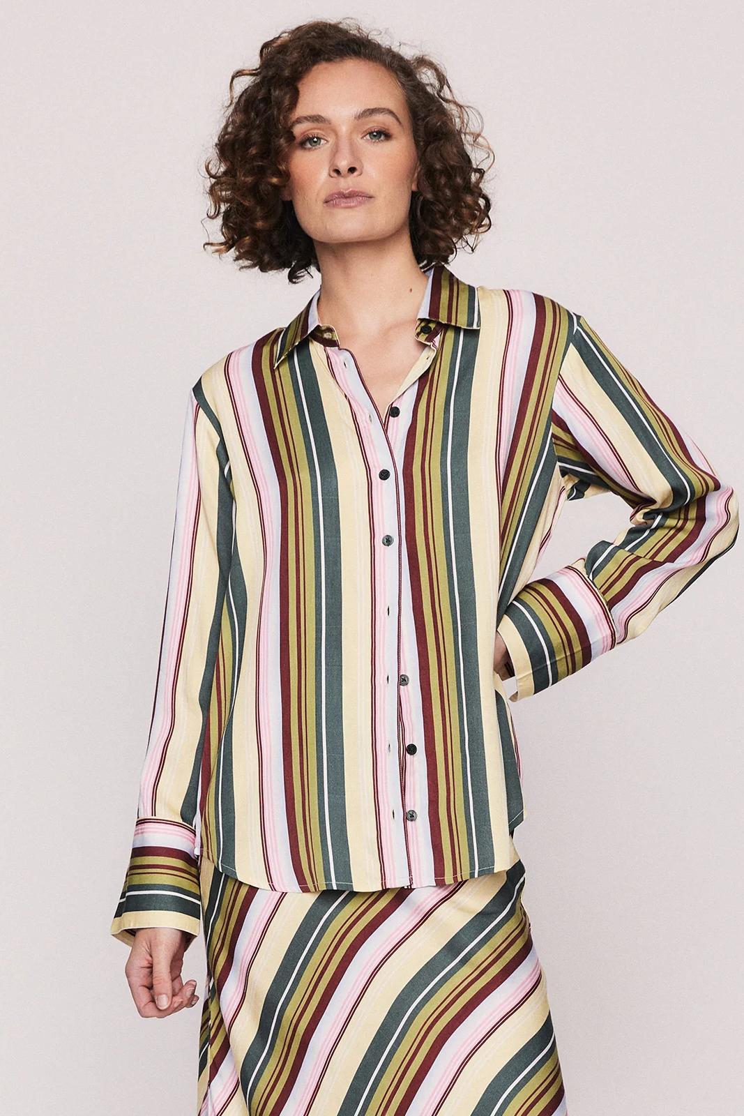This set embraces timeless vintage style. Featuring a striped shirt with a classic collar and button-front design, paired with a matching maxi skirt adorned with diagonal stripes, it exudes effortless sophistication. The smooth, high-quality fabric gives a polished feel, while the coordinated stripes create a cohesive, retro-chic look.